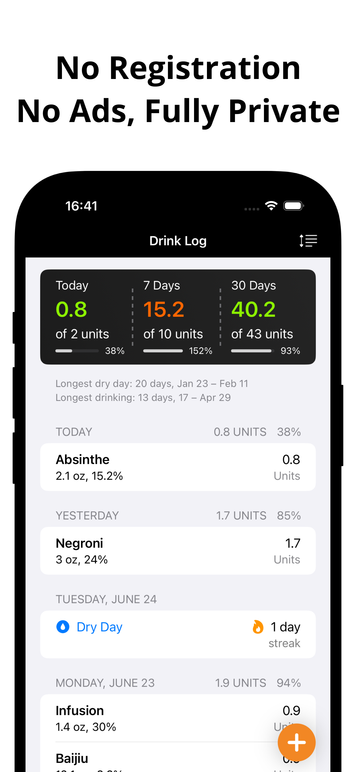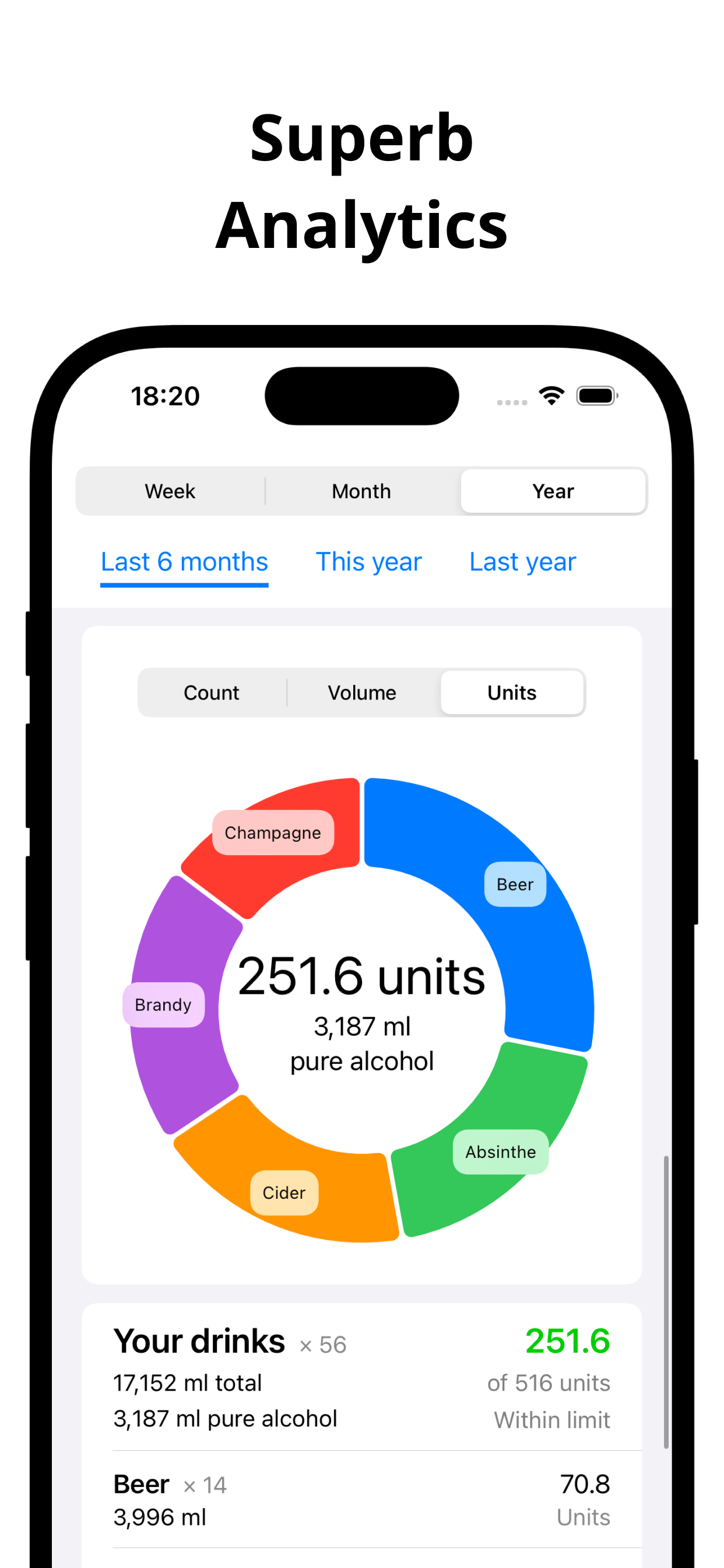 Add common drinks with one tap. Customize volumes and ABV.