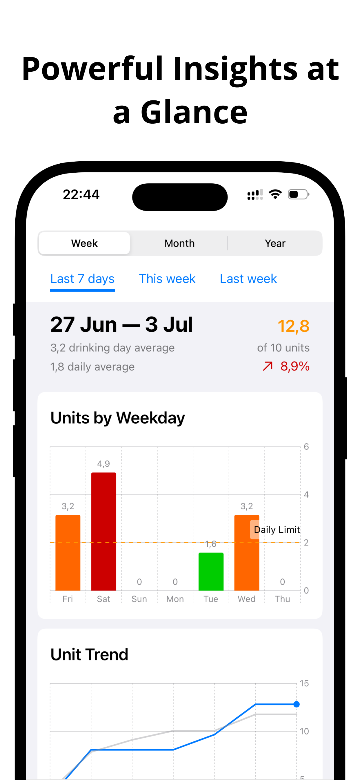A super‑light iOS app to log drinks, set gentle limits, and see clear weekly trends.